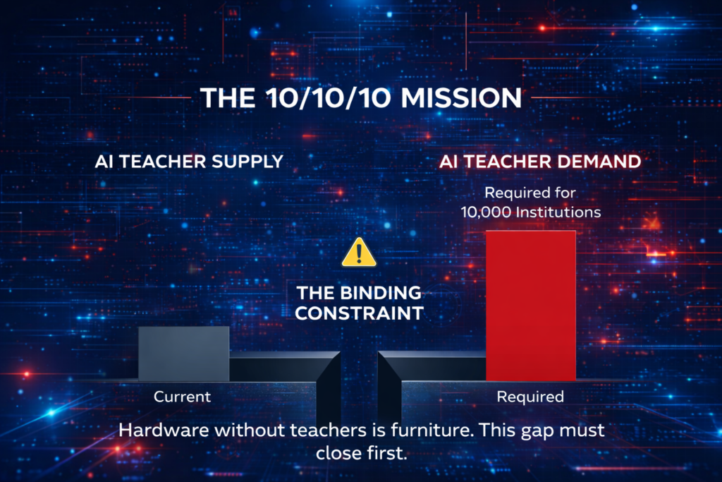Many institutions lack any form of backup power. Others have 10-year-old solar installations that no longer meet capacity. Connectivity problems are acute in Tier 2 and Tier 3 cities and rural areas where demographic growth is highest. This infrastructure burden falls partly on institutions, partly on state governments, and partly on technology partners. Solving it requires acknowledging that AI readiness is ultimately an infrastructure readiness problem. The 10/10/10 Mission succeeds or fails not on pedagogy but on whether the power stays on and the network stays up.