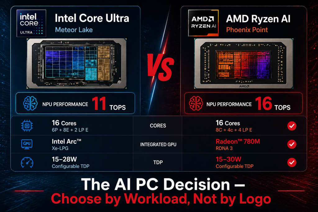 Both Intel Core Ultra (Meteor Lake, Arrow Lake) and AMD Ryzen AI (Phoenix, Hawk Point) families ship with integrated NPUs; both meet the 40+ TOPS threshold for Copilot+ certification. For Indian enterprises, the choice is not about raw TOPS—it’s about ecosystem maturity, thermal performance, availability in India, and OEM support.