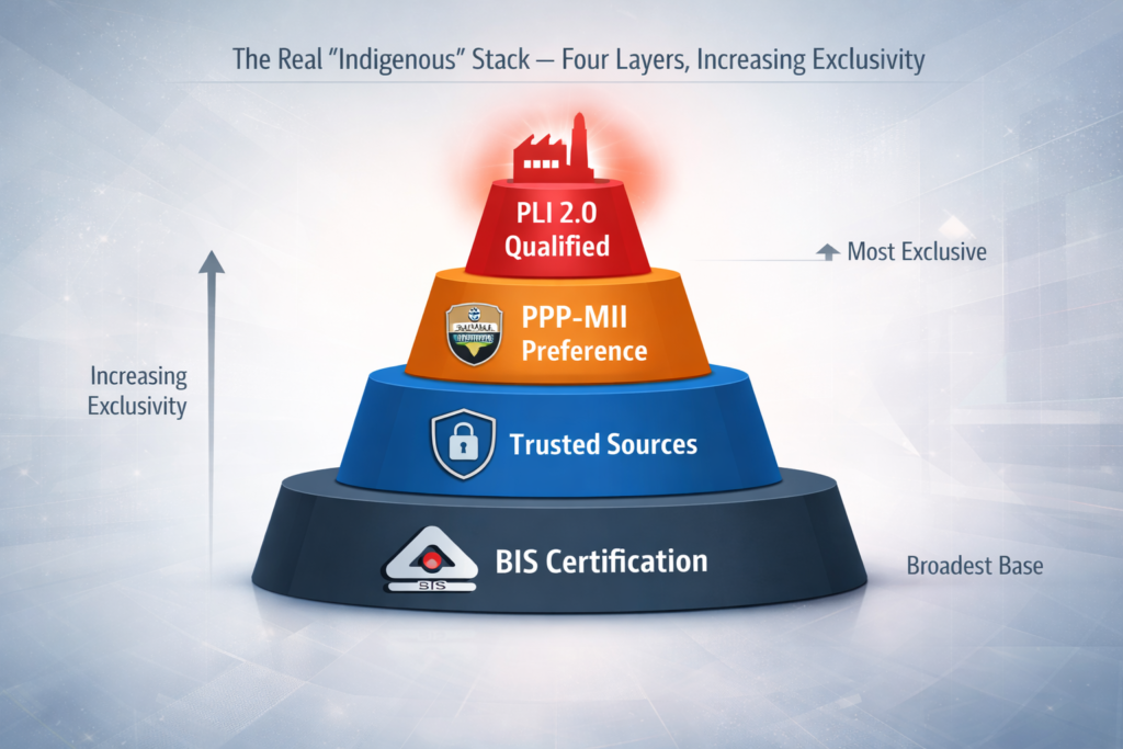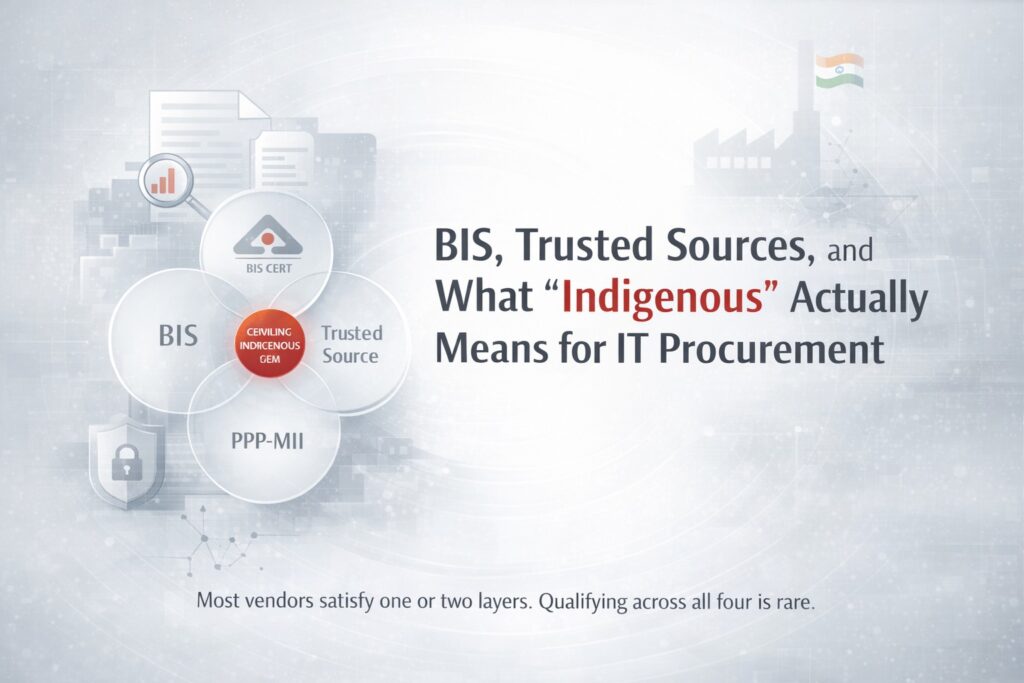 “Indigenous” is a word that gets used in RFPs more than it is understood. For government IT procurement in India, it is not a single standard but a stack of specific, overlapping compliances—each with its own notification, registration window, and enforcement mechanism. PSU IT heads and procurement officers often conflate these layers, leading to disqualified bids, delayed deployments, and supply-chain surprises. The stack consists of four distinct elements: BIS (Bureau of Indian Standards) certification, Trusted Sources and Trusted Products lists managed by NCSC and MeitY, PPP-MII local-content thresholds under DPIIT, and PLI 2.0 manufacturing incentives. Each serves a different policy objective, and nearly all are mandatory in parallel for sensitive government IT deployments.