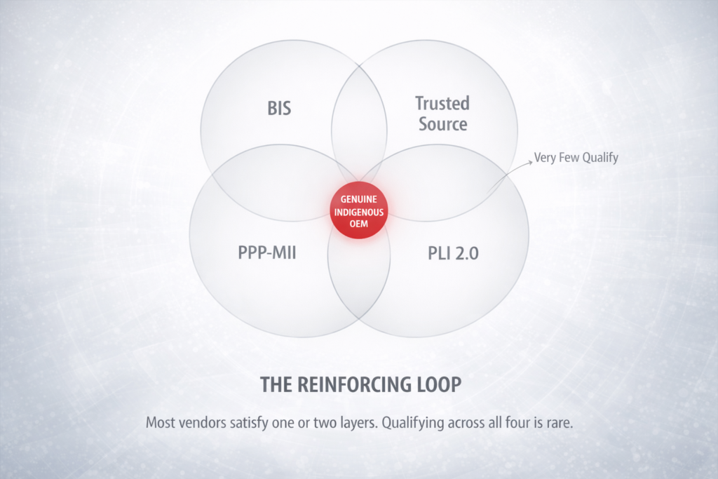“Indigenous” in Indian government IT procurement is a specific technical achievement, not a nationalist sentiment. It requires simultaneous compliance with quality standards, security vetting, local-content thresholds, and manufacturing-scale incentives. Few OEMs in India hold all four credentials in parallel across product lines. This is partly due to the recent consolidation of these rules (Trusted Sources and PLI 2.0 are post-2022 additions), and partly due to the investment and transparency required to pass multiple independent audits.