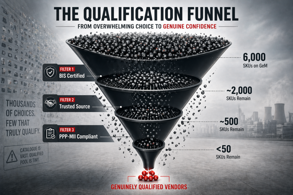 Here’s a practical move that separates sophisticated PSU procurement from the tired cycle: build a comparative catalogue before you open the reverse auction. Pull the top 8–10 vendors in your product category from GeM. For each vendor, list (1) their full SKU range in your category, (2) forward-validated lead times, (3) BIS status, (4) warranty and SLA terms, and (5) MSE-I eligibility. This takes two hours. It will show you immediately which vendors are serious about PSU supply and which are spot-bidders hoping for an L1 hit.