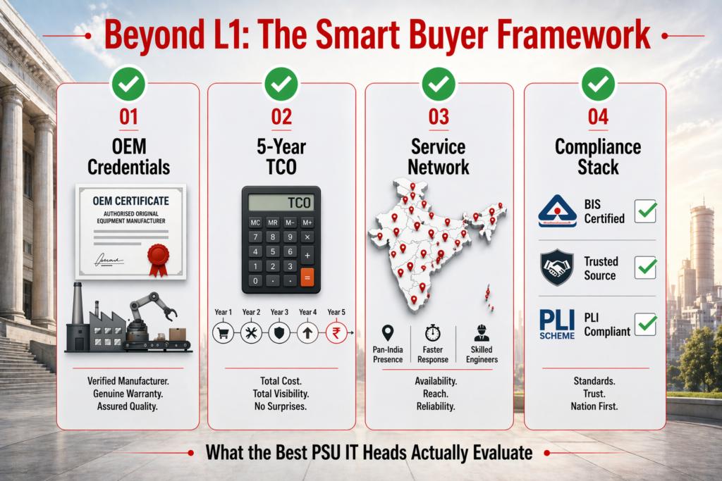 This happens because PSU IT heads — and their procurement teams — often treat GeM SKUs as equivalent to retail specs. A “Desktop PC 16GB RAM” in the GeM catalogue isn’t the same product across vendors. One vendor’s entry includes onsite support for 36 months; another’s has none. One carries BIS, another carries only factory certification. You’re not comparing apples; you’re comparing the OEM’s ability to service a government contract under duress.