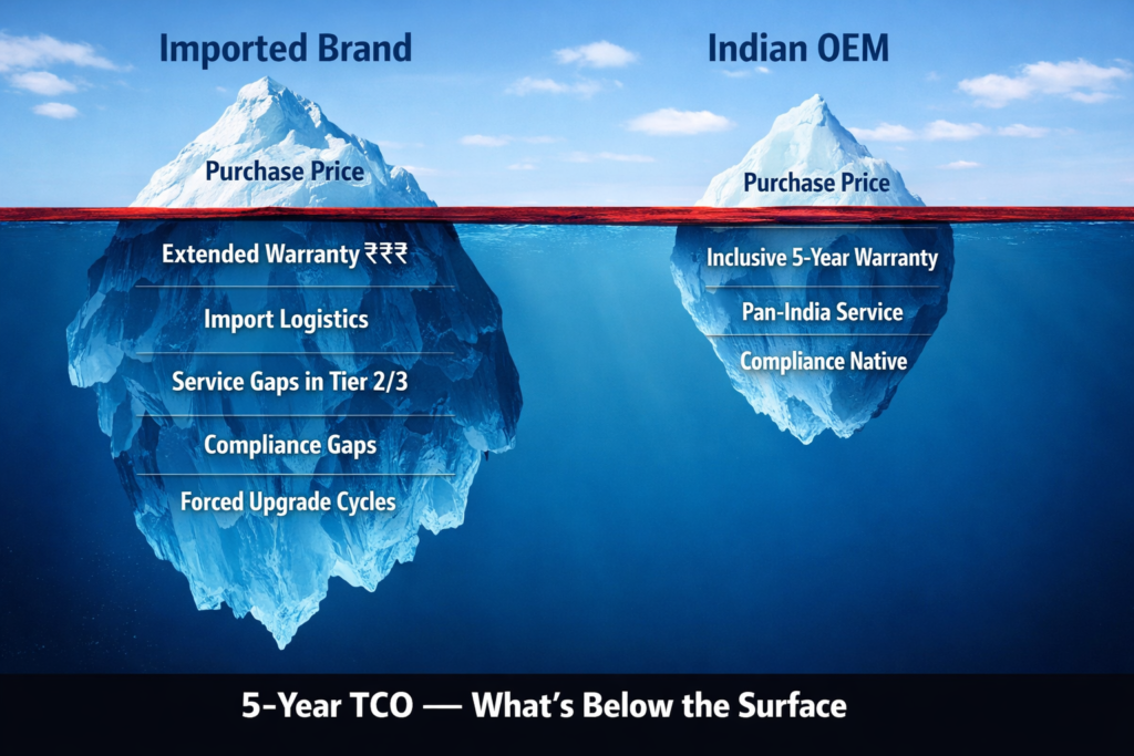 The data suggests two paths. The first is a hybrid model: Indian OEMs for distributed field operations where field serviceability and response time matter, global OEMs for centralized facilities where managed services and brand reputation justify premium capex. The second is a full Indian OEM deployment coupled with internal build-out of IT support capability, which typically pays for itself within 2.5 years on fleets above 1,000 units.
