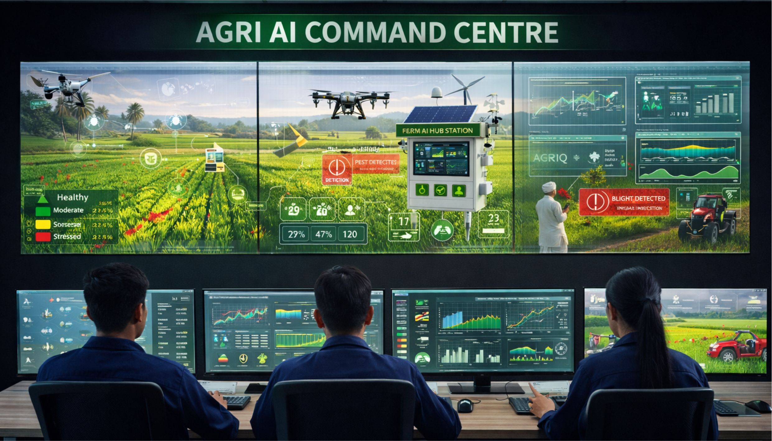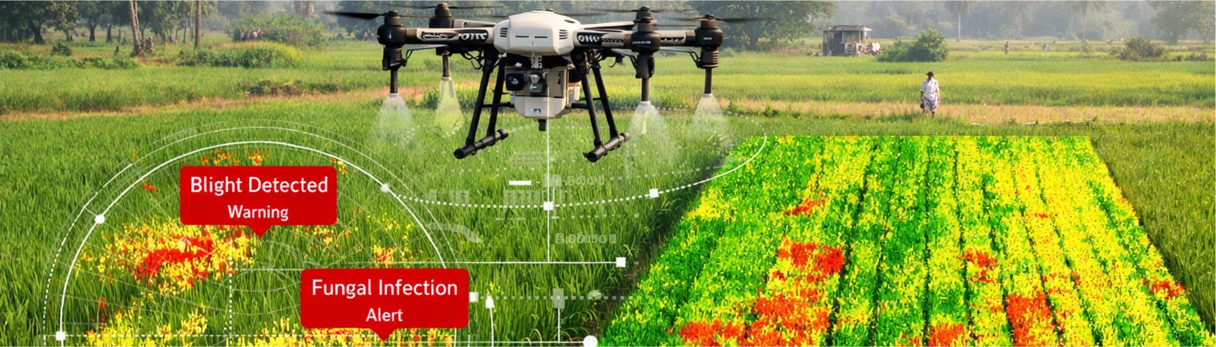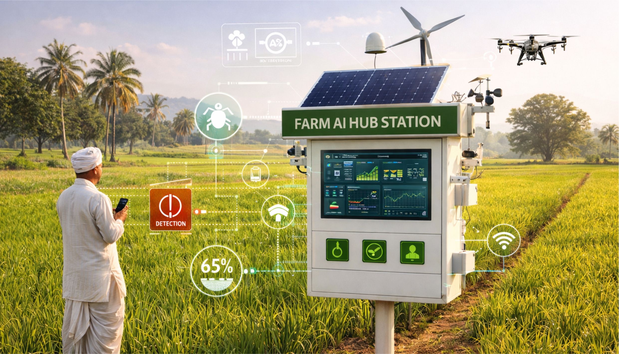Crop disease detection with 94%+ accuracy on 50+ Indian crops, precision irrigation saving 30–40% water, yield prediction 4–6 weeks pre-harvest, and drone analytics — all running offline, solar-powered, in zero-connectivity fields.