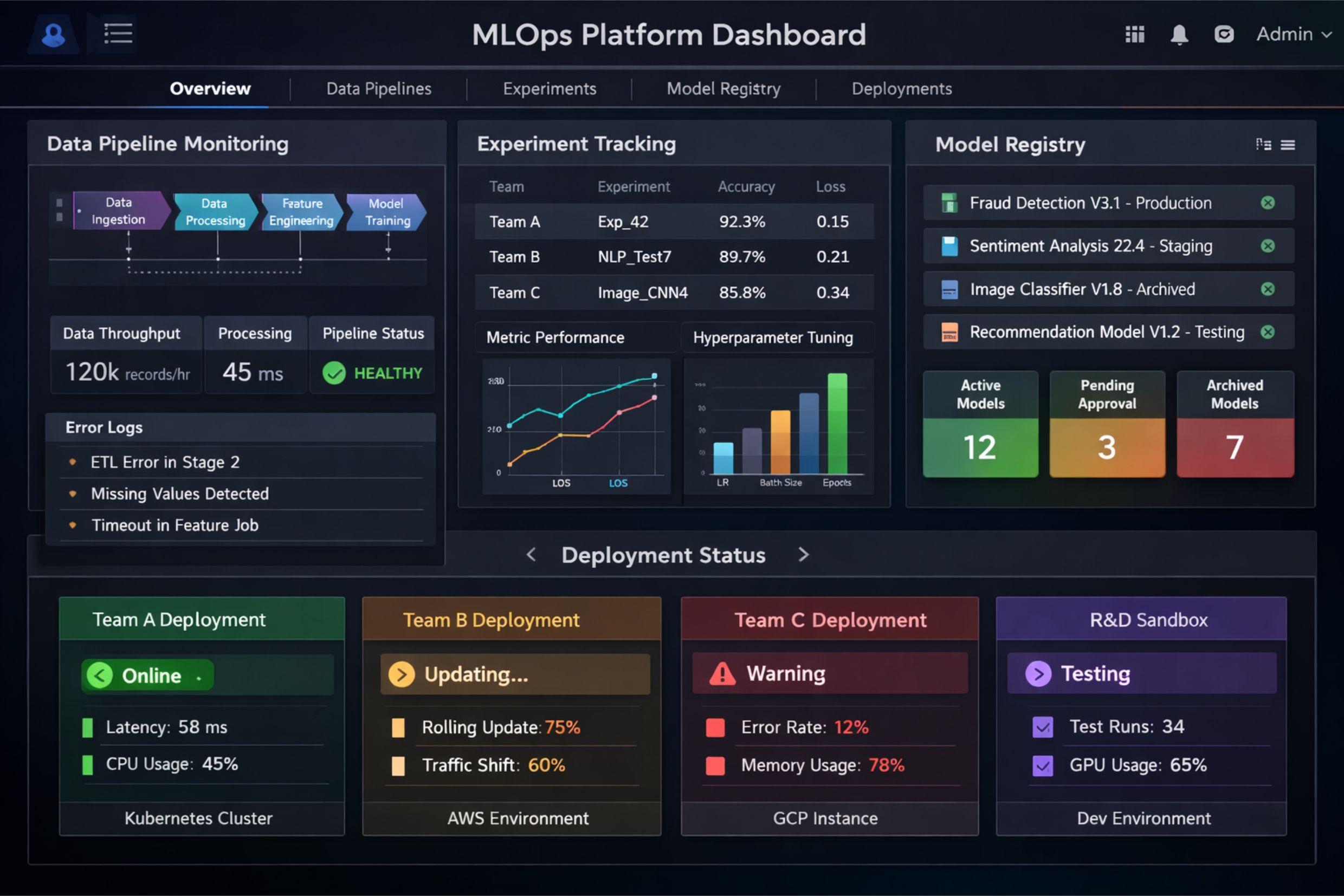 | Model Registry | MLflow + Git | Versioned model storage with staging, production, and archive lifecycle | Automated CI/CD |